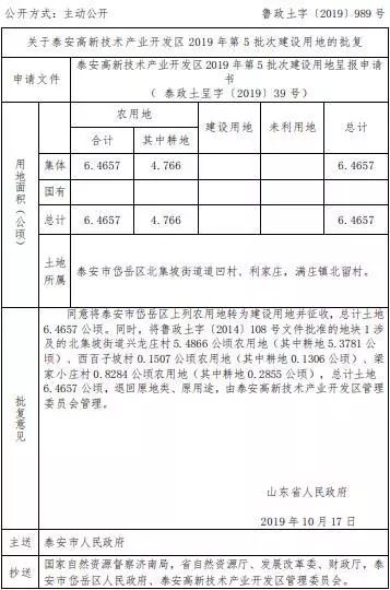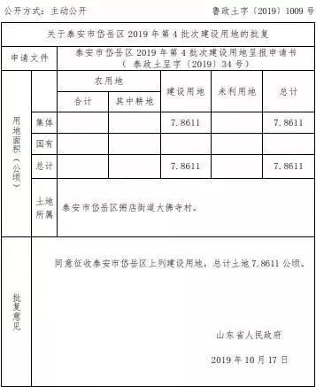 土地所属:泰安市岱岳区粥店街道大佛寺村。批复意见:同意征收泰安市岱岳区上列建设用地,总计土地7.8611公顷。2019年第5批次建设用地
