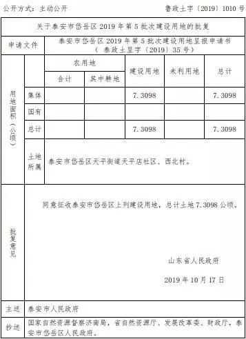 土地所属:泰安市岱岳区天平街道天平店社区、西北村。批复意见:同意征收泰安市岱岳区上列建设用地,总计土地7.3098公顷。泰安高新技术产业开发区2019年第5批次建设用地