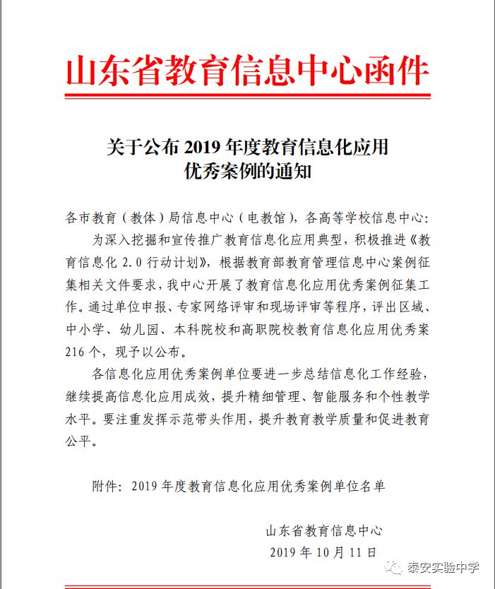 近日,泰安实验中学推送的案例《一卡通下的智慧校园》被山东省教育信息中心评选为山东省2019年度教育信息化应用优秀案例。