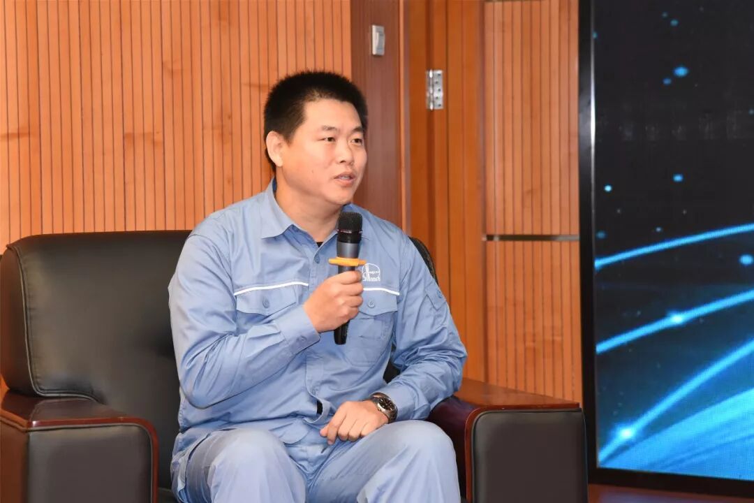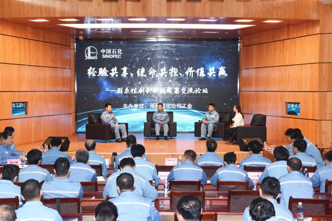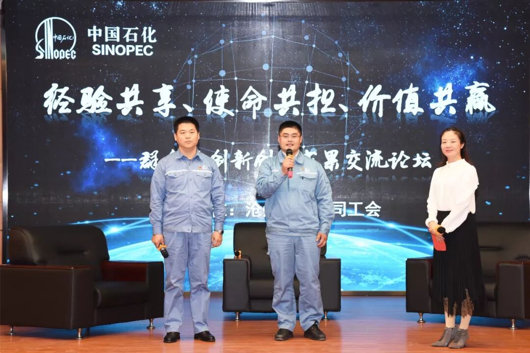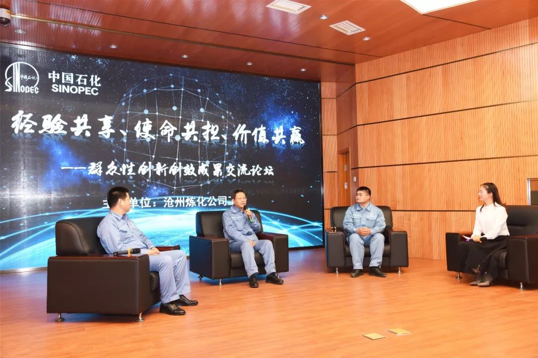 论坛第二环节,沧州炼化公司总经理、党委副书记周庆水与两位职工创新带头人代表一同走上主席台,通过主持人互动访谈和现场提问,与大家交流对推动群众性创新创效工作的想法。