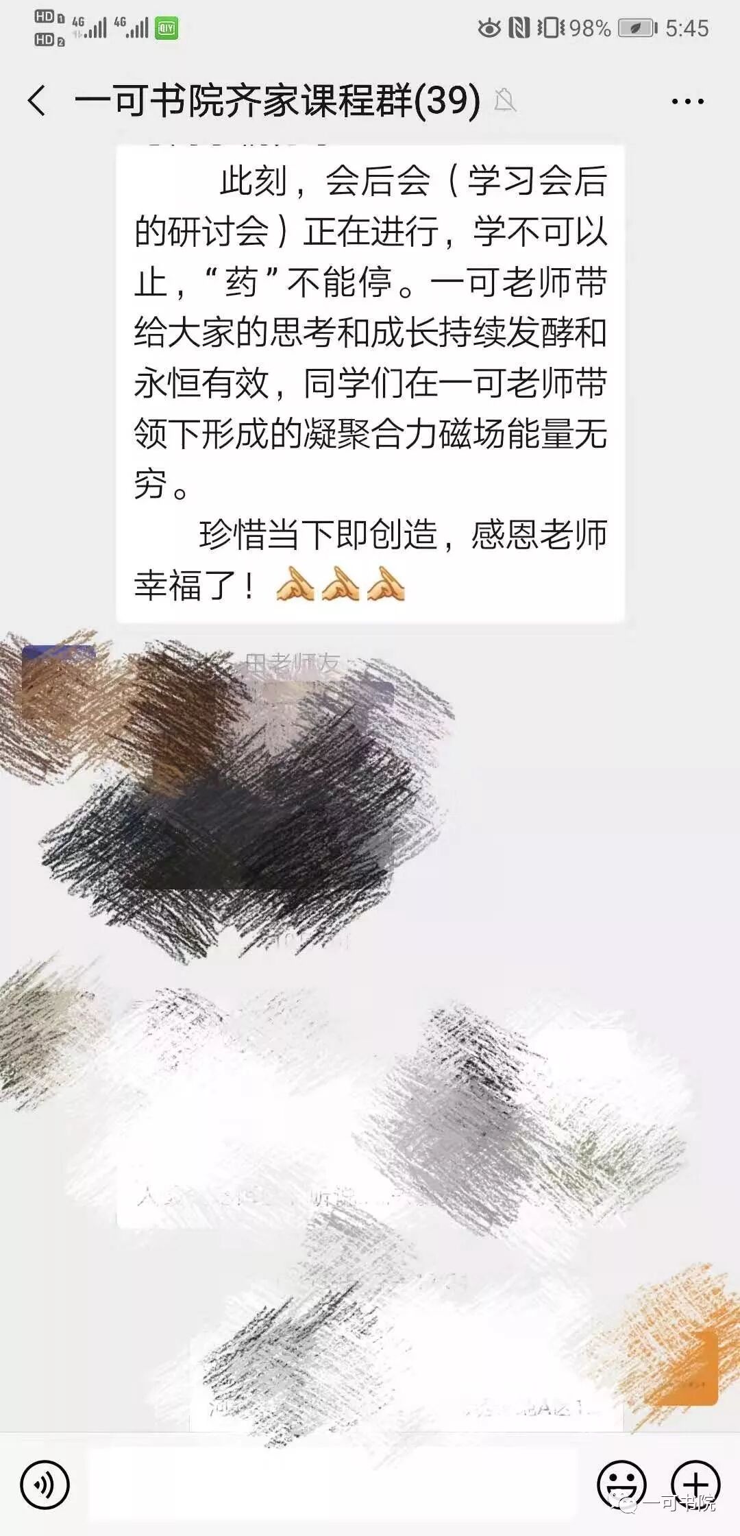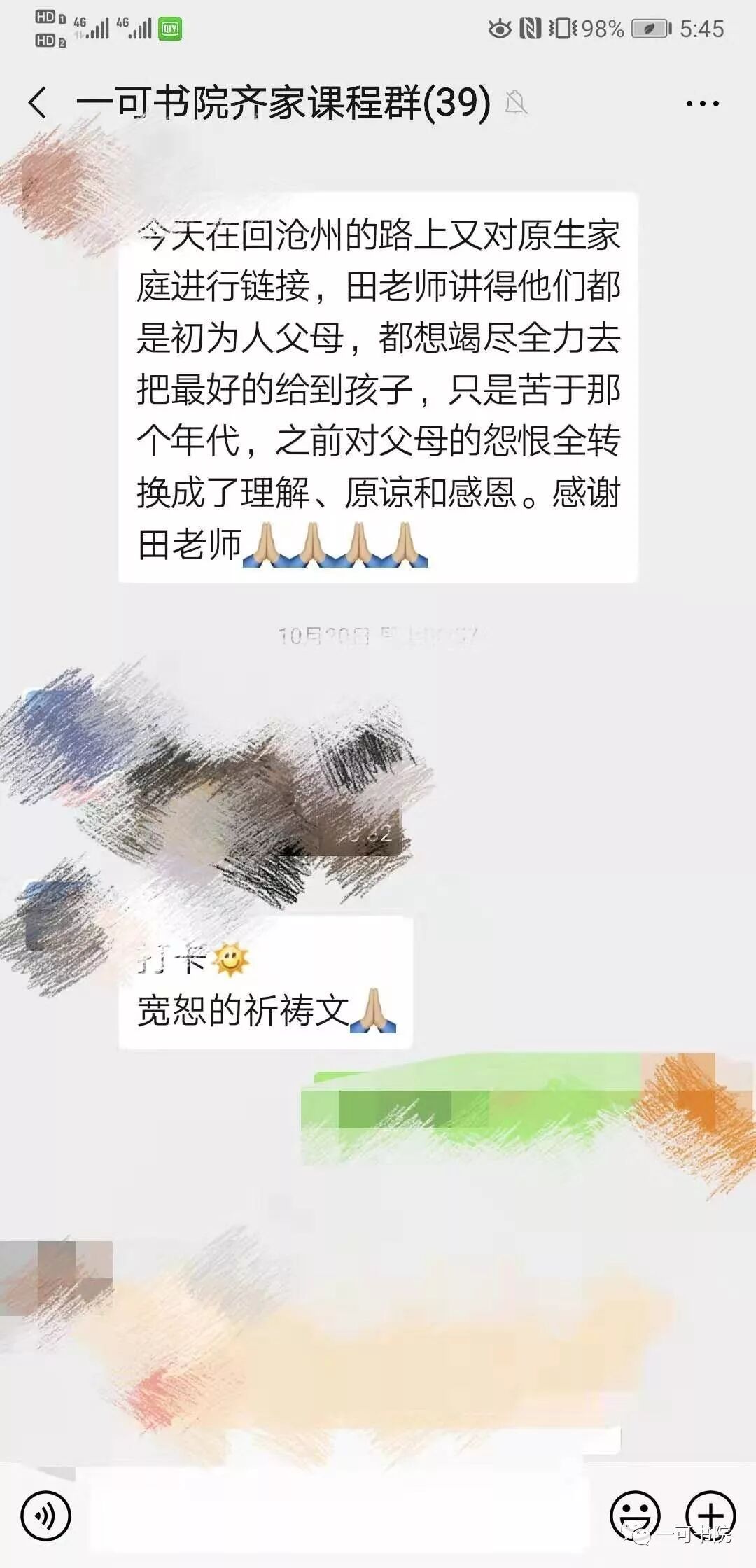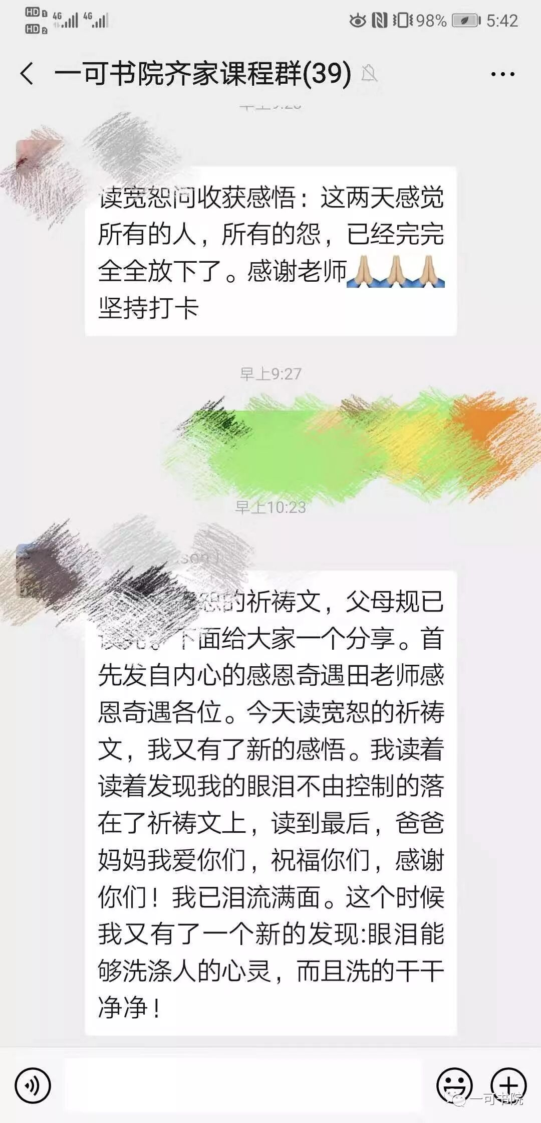 两天课堂课程不知不觉中结束,但课程学习还在继续,课下老师一对一指导,建群大家一起监督打卡,每天诵读宽恕文,家庭自律文,父母规。宽恕和原谅不只这两天,相信它会融入大家的每一天。宽恕所有的一切,宽恕自己,过幸福人生。