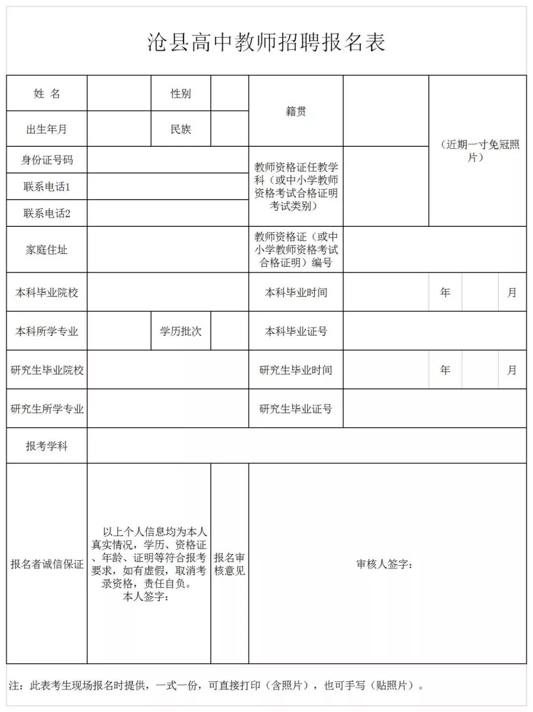 1、考生可在公告附件下载《沧县教师招聘报名表》,打印或手写一式一份,并由考生本人签字。