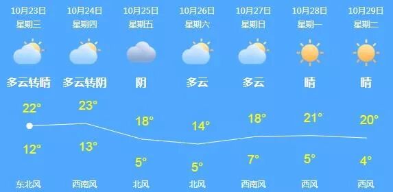 今天白天到夜间,多云间阴,早晨有轻雾或雾,偏北风2~3级,气温22~12℃;24日白天到夜间,多云转阴,偏南风2~3级转偏北风3~4级,气温23~14℃;25日白天到夜间,阴转多云,偏北风3~4级转2~3级,气温18~5℃。
