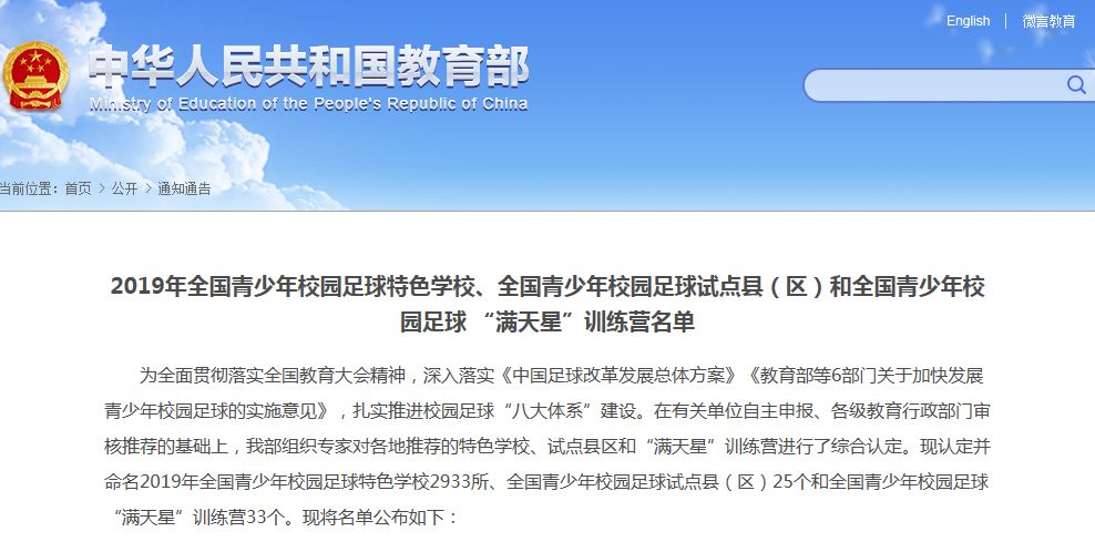 为全面贯彻落实全国教育大会精神,深入落实《中国足球改革发展总体方案》《教育部等6部门关于加快发展青少年校园足球的实施意见》,扎实推进校园足球“八大体系”建设。在有关单位自主申报、各级教育行政部门审核推荐的基础上,我部组织专家对各地推荐的特色学校、试点县区和“满天星”训练营进行了综合认定。现认定并命名2019年全国青少年校园足球特色学校2933所、全国青少年校园足球试点县(区)25个和全国青少年校园足球“满天星”训练营33个。
