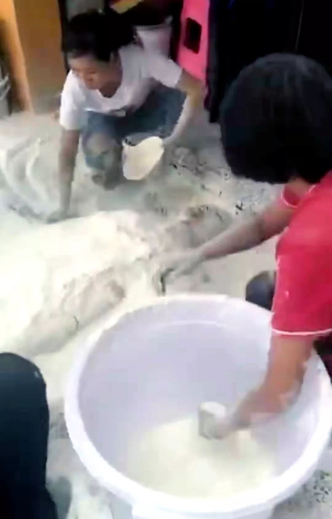 看到这种情况后,心急如焚的家属一边联系120急救车,一边采取当地的偏方救治,即找来一桶面粉,先铺一些在地上,再让伤者躺在面粉上,接着从头到脚撒满厚厚的面粉。