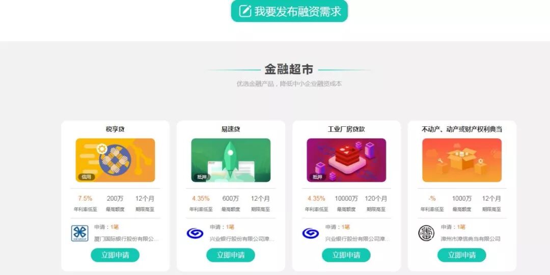 答:有融资需求的企业可在漳州综合金融服务平台(http://www.zzjr.net/)首页点击发布融资需求,填写融资信息,确认发布后,系统会为您推荐合适的金融产品。选择金融产品并提交预审材料后,等待工作人员电话回访。