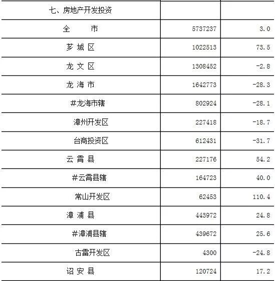 近日,漳州统计局发布2019前9个月的主要经济指标。指标显示,今年1-9月,全市房地产开发投资超573亿元,比增3%。其中,芗城区约102.3亿元,比增73.5%。龙文区约130.8亿元,比增-2.8%。增长最大的是东山县,达124.7%。