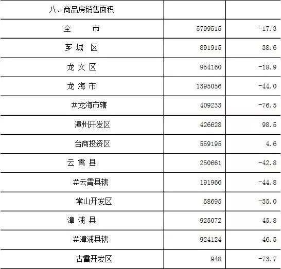 在商品房销售方面,全市1-9月累计销售商品房约580万平,同比增长-17.3,%。其中龙海(含台商投资区和漳州开发区)销售量居全市之首,达约139.5万平。其次龙文区,约95.4万平。漳浦县仍是全市前三甲,销售量约92.5万平。