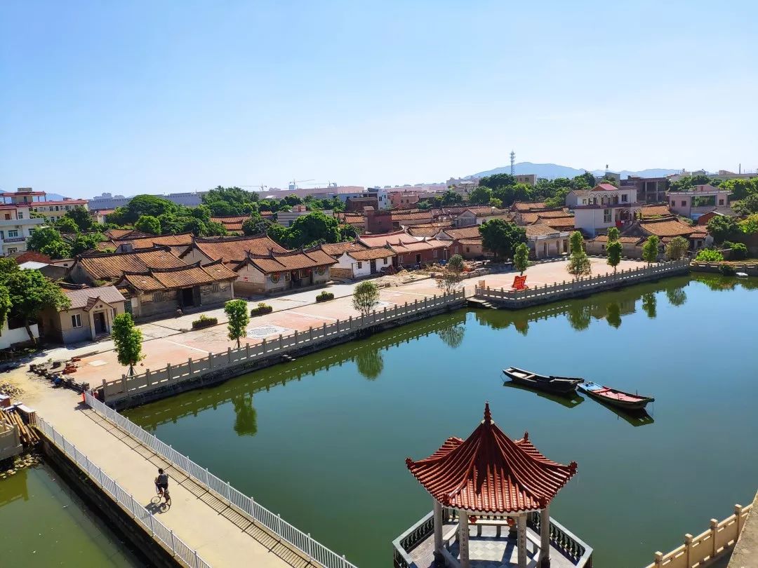 漳州台商投资区角美镇杨厝古大厝和碧湖景观。