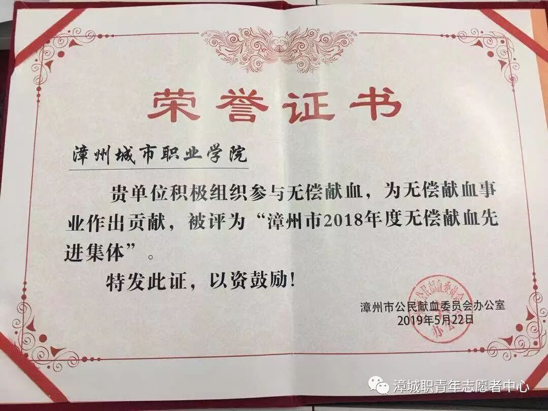 喜讯|漳州城市职业学院荣获“漳州市2018年度无偿献血先进集体 ”