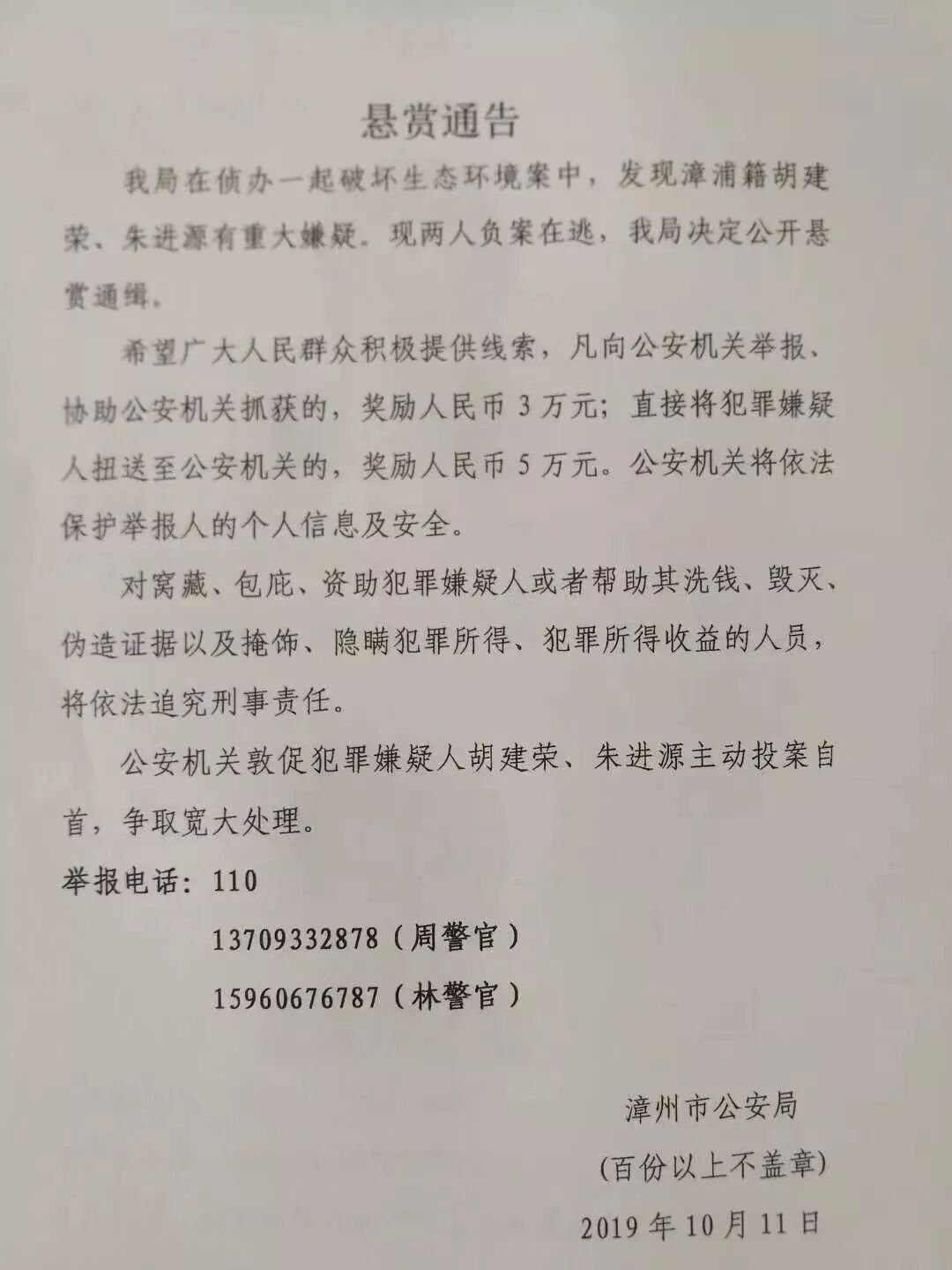 我局在侦办一起破坏生态环境案中,发现漳浦籍胡建荣、朱进源有重大嫌疑。现二人负案在逃,我局决定公开悬赏通缉。