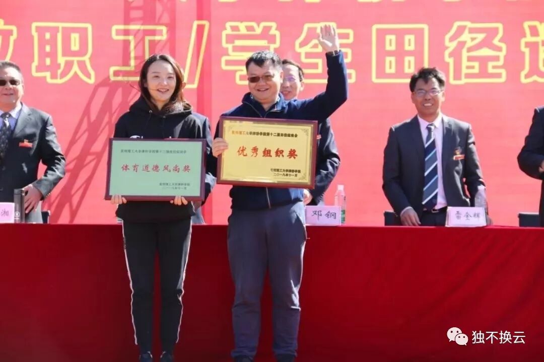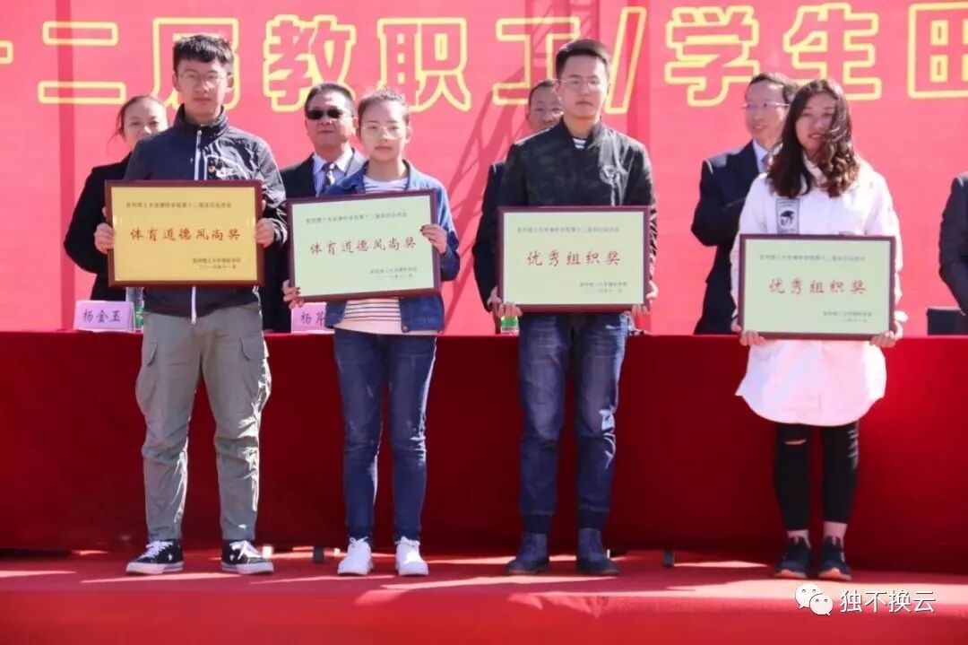 最后颁布的是学生体育道德风尚奖经济管理学院,建筑工程学院,优秀学生组织奖获得者理工学院,语言文化学院。和教职工体育道德风尚奖获得者理工学院,优秀组织奖获得者机关一队。
