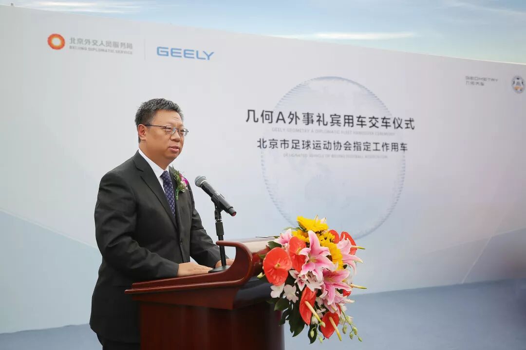 北京外交人员服务局副局长陈闯,北京市足协主席、北京市体育局副局长杨海滨与吉利汽车集团副总裁林杰,几何品牌销售公司总经理郑状共同完成新车交付。