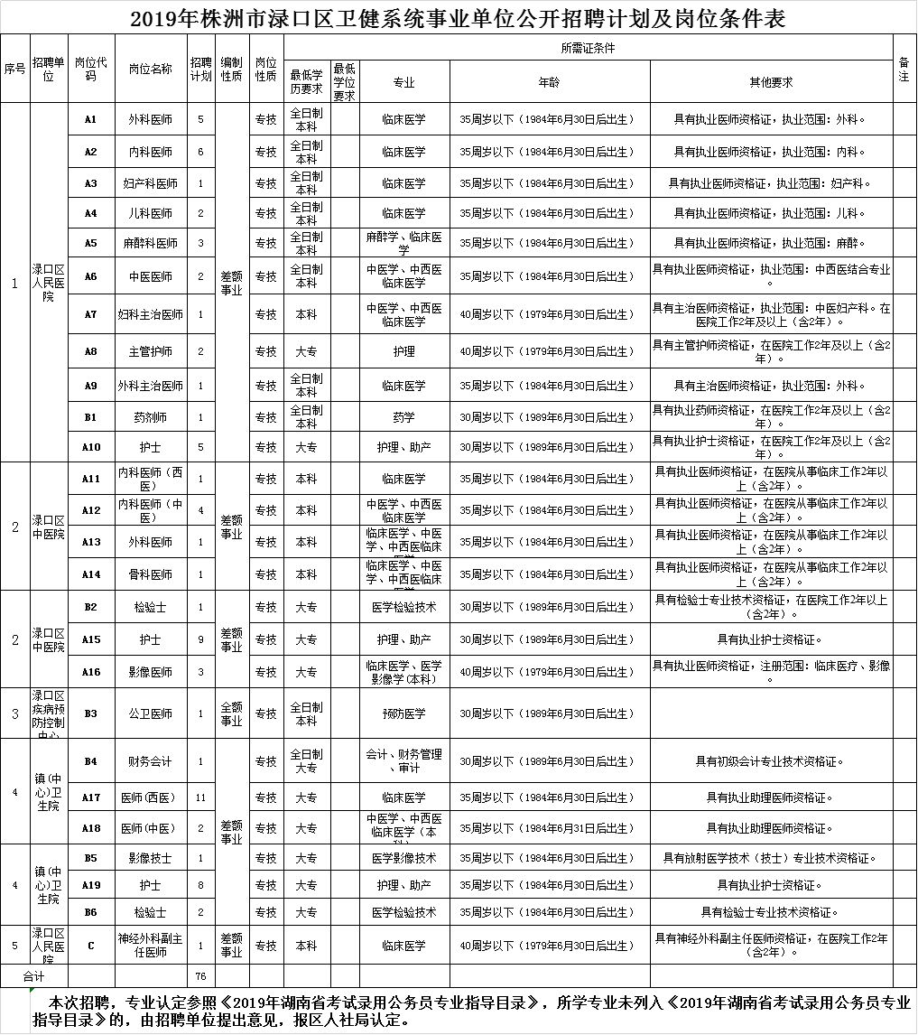 为进一步深化事业单位人事制度改革,建立科学、公正、规范的用人制度,拓宽事业单位选人用人渠道,优化事业单位工作人员队伍结构,根据《事业单位人事管理条例》(中华人民共和国国务院令652号)、《湖南省事业单位公开招聘人员办法》(湘人社发[2019]1号)、《关于印发进一步加强基层医疗卫生服务能力建设的若干政策措施的通知》([2018]3号)、《人力资源社会保障部加强基层专业技术人才队伍建设的意见》(人社部发[2016]57号)等有关规定,结合本单位编制、岗位空缺情况和工作需要,经研究,决定面向社会公开招聘事业单位工作人员76名。