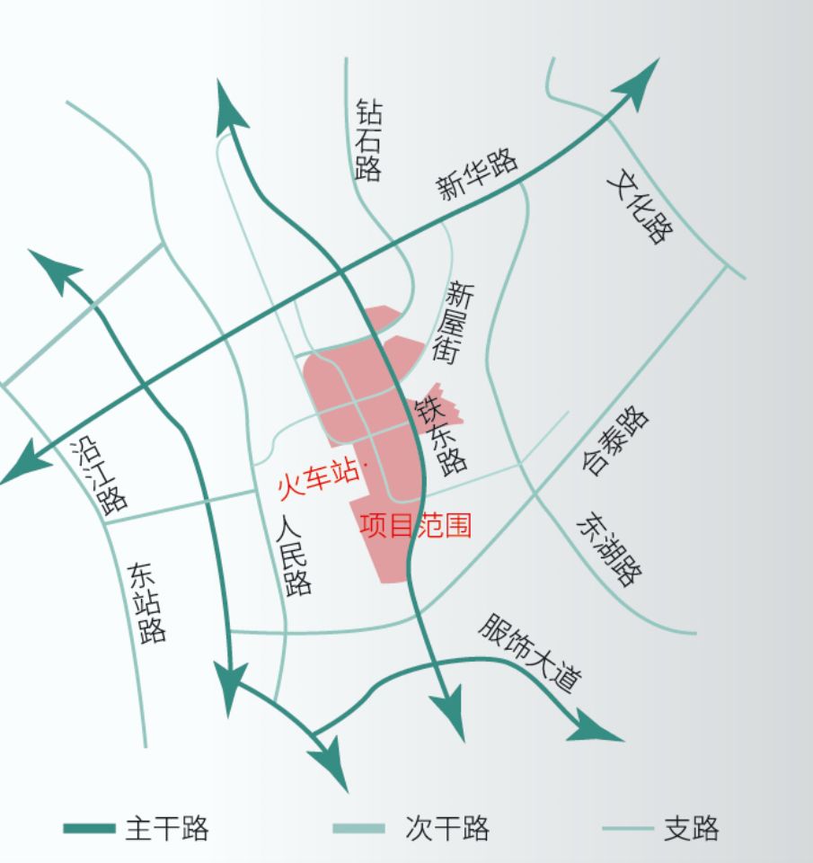 (三)项目区位:项目位于株洲市中心区域、城市核心商圈,紧邻株洲火车站、城际站、千亿服饰城,地理位置非常优越。四至范围:新华路以南、合泰路以北、铁路线以东、铁东路核心段两厢。