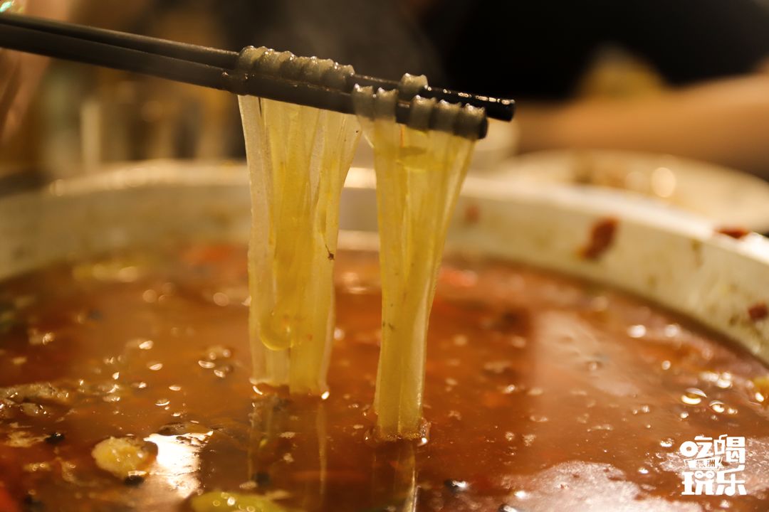 纯手工制成的红薯粉不需要在锅里涮太久,两到三分钟足矣。煮好的红薯粉有点透明感,吸饱了锅里浓郁的汤汁,大口吸溜韧劲十足。