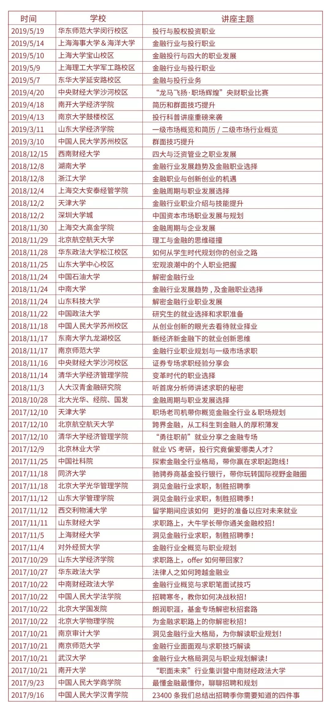 六年公益,百校巡讲,六年来坚持支持各地学校职业发展,每年都会集中数次走进全国各大高校 ,与各校就业中心深度合作,根据学校特色及需求,定制相应的职业分享内容,包括行业大咖讲座、师兄师姐返校分享、校招情况解析、求职技能提升、求职比赛协办等,金融小伙伴是你求职路上的永远陪伴。近期高校巡讲如下: