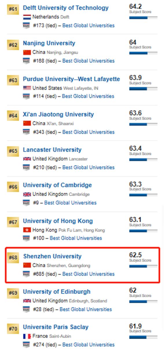 10月22日,U.S.News发布了2020年世界大学排名,本次排名涵盖了超过80个国家的1500所顶尖院校,深圳大学位列世界第685。其中计算机科学学科排名中,深圳大学跃居世界第68位,全国第17位,位居广东省第一。