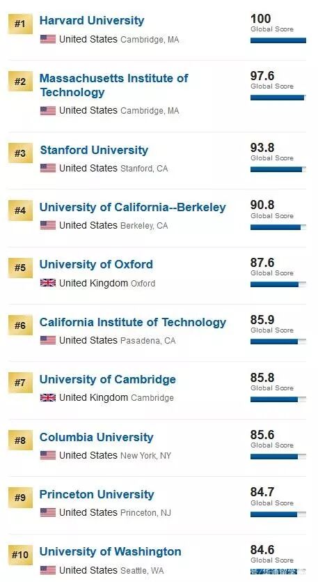 哈佛再次荣登榜首!麻省理工第二,斯坦福今年没能和麻省并列,位居第三。加州大学伯克利分校取得第四,英国牛津大学依旧第五。