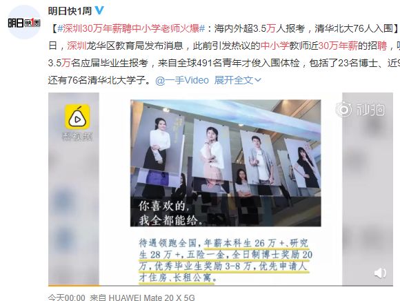年薪本科生26万元以上,研究生28万元以上,全日制博士奖励20万元,优秀毕业生奖励3-8万元……今年9月,深圳市龙华区教育局发布消息称,区公办中小学面向海内外2020届应届毕业生招聘教师约400人。因给出近30万元年薪,该招聘信息引起热议。