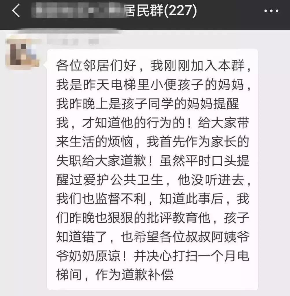 某高层小区有个孩子,跑到32楼顶往下扔砖头,刚好有位阿姨遛弯差点被砸到。 面对旁人的责问,家长回应说:“又没砸到人,都少说几句,别吓着孩子。” “熊孩子”的行为虽可恨,但更让人气愤的,是这位“熊家长”的态度。 相比之下,西安另一位家长的处理方式,则体现了极高的教养,也极为明智。 在西安某小区的一个电梯里,一位8岁孩子在电梯里撒尿,引起了各位业主的不满。 孩子妈妈知道后,没有装聋作哑推脱“孩子还小,别和他计较”。 而是先在业主群里发文道歉,再让孩子亲笔写了检讨书,并承诺让孩子打扫一个月电梯作为惩罚。