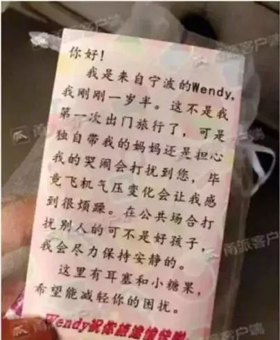 孩子的鞠躬,却让司机内心愧疚,起初他还担心孩子摔倒讹诈他。 投之以桃,报之以李,弯腰行礼,以示感激,孩子一个小小的行为,赢来百万点赞,「孩子太有教养了。」 一位年轻妈妈独立带宝宝坐飞机,因为怕宝宝吵闹,打扰其他人,于是给周围旅客每人发了一份小礼物,并附带了下面这张卡片。