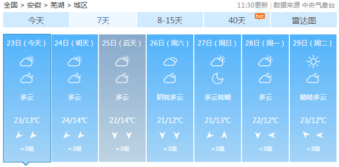 预计未来一周我省大部分地区以多云天气为主,其中22日大别山区和沿江江南部分地区、26-27日沿江江南局部地区有小雨。