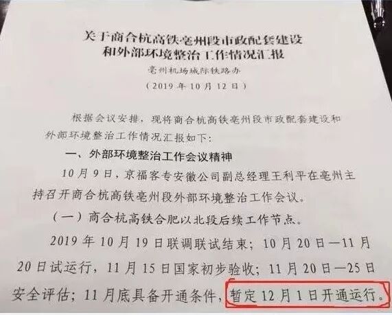 进展按照计划10月20日至11月20日商合杭高铁北段试运行;11月15日,国家初步验收北段线路;11月20日至25日,进行安全评估;11月底具备开通条件。