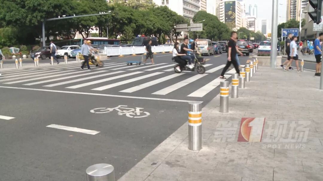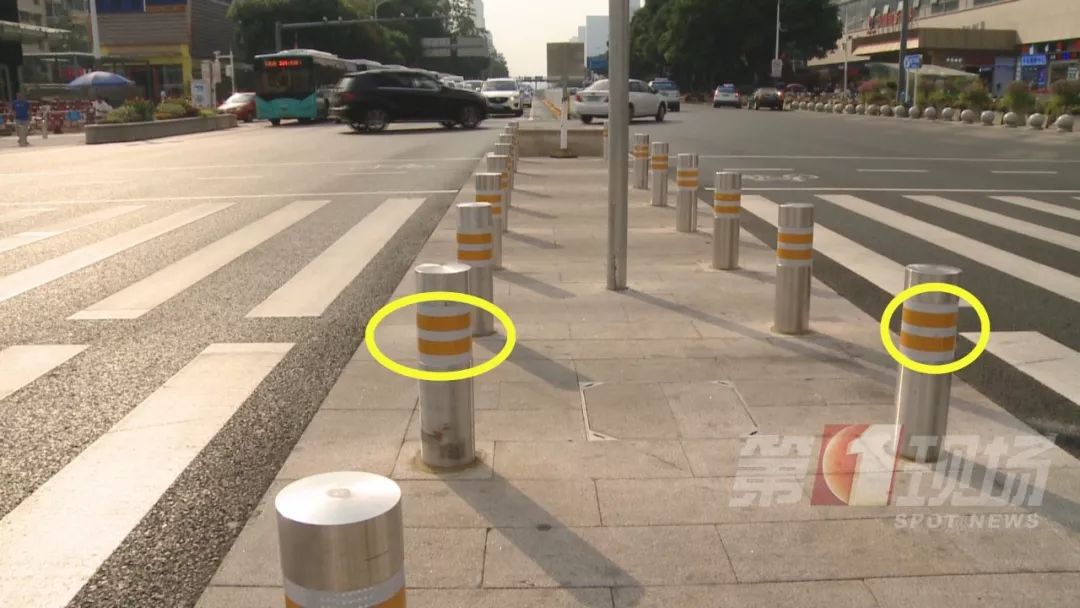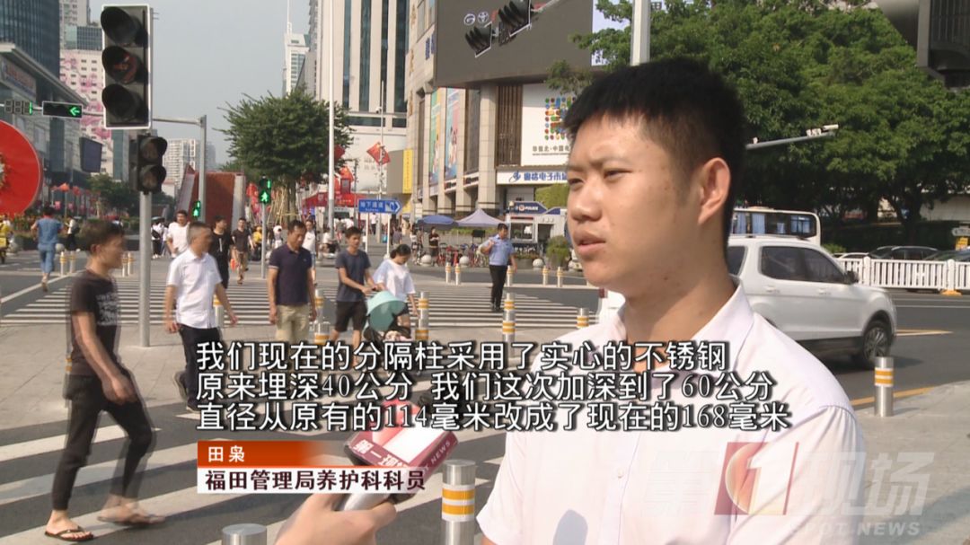 记者了解到,本次深南华强路口人行过街提升工作中,创新使用了增强式分隔柱,材料为实心不锈钢,直径增加到16.8厘米,单根重量达到0.21吨;按照埋深60厘米、外露60厘米设置;防撞柱基础为钢筋砼基础,采用镀锌角钢、钢筋焊接固定以及混凝土现浇的施工工艺。