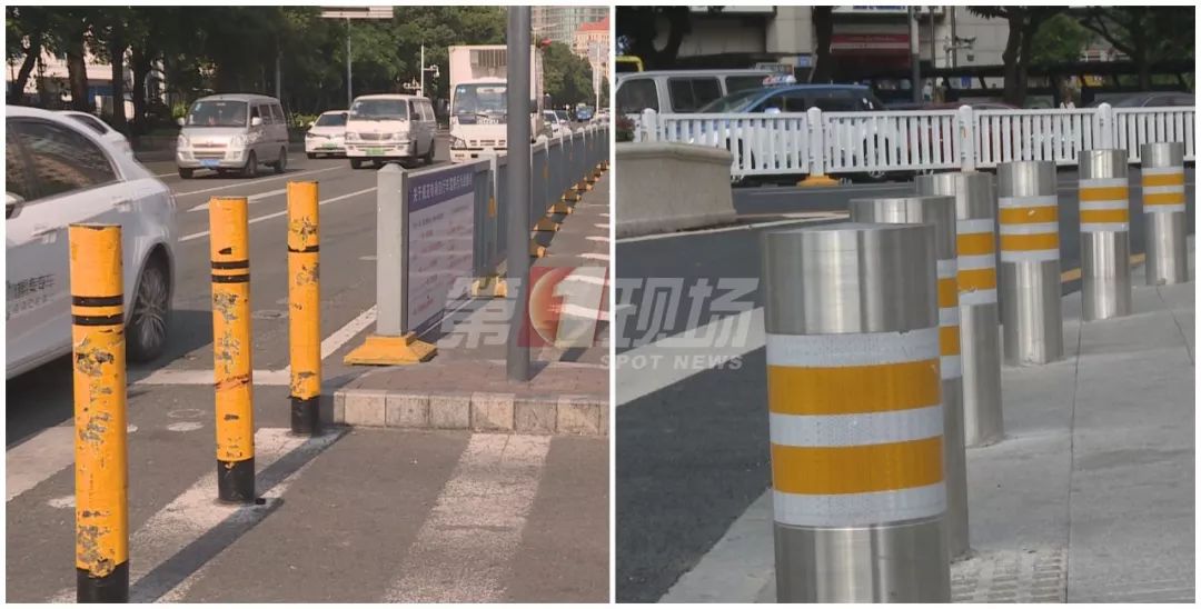 ▲左图为目前大多安全岛的分隔柱,右图为深南华强路口的新版分隔柱。