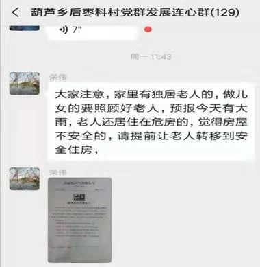 在“七上八下”的汛期到来之际,“党群发展连心微信群”充分发挥了它的作用。赵宁利用微信群及时发布灾害性天气预警信号,尤其对有坑塘、独居老人等弱势群体的村提前进行安排部署,组织受灾群众安全转移。在强降雨天气过后,她第一时间对防汛工作进行总结,根据群众在微信群中反馈的问题以及提出的建议,及时与领导沟通,调整工作方向和工作方式,确保全乡人民群众财产生命安全。