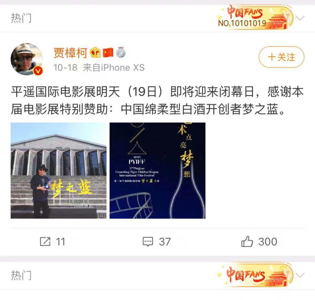 近日,著名导演贾樟柯在微博上发布了一条博文感谢梦之蓝,他写道:“感谢本届电影展特别赞助:中国绵柔型白酒开创者梦之蓝。”并配上了自己与梦之蓝的合影。