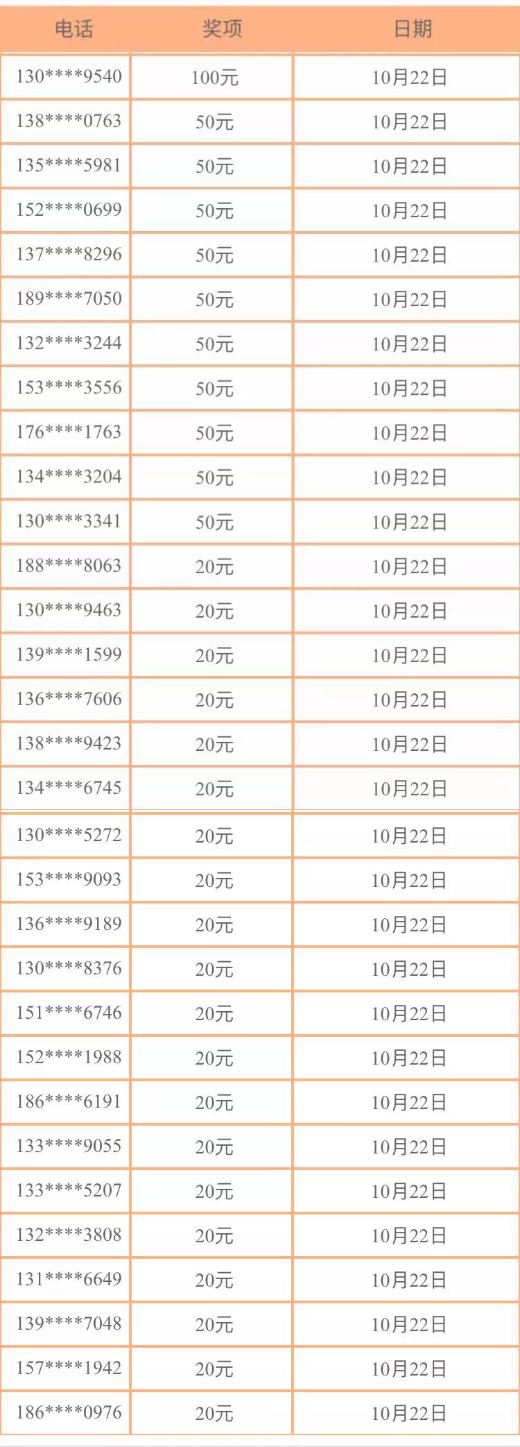 50元话费(10名)三等奖: