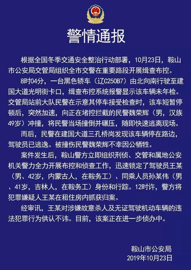 10月23日上午,鞍山市交管局站前大队民警魏荣辉在执行任务时,被一辆未年检车辆冲撞碾压,不幸遇难。23日下午3时50分许,鞍山市公安局官方微信针对事件发布通报,犯罪嫌疑人王某已于当天被抓获归案,经审讯,王某对涉嫌故意杀人及无证驾驶机动车辆的违法犯罪行为供认不讳。目前,该案正在进一步侦办中。