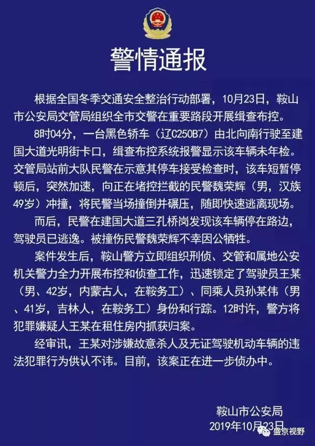 23日,辽宁省鞍山市公安局官方微博通报,8时04分,一台黑色轿车(辽C250B7)由北向南行驶至建国大道光明街卡口,缉查布控系统报警显示该车辆未年检。交管局站前大队民警在示意其停车接受检查时,该车短暂停顿后,突然加速,向正在堵控拦截的民警魏荣辉(男,汉族,49岁)冲撞,将民警当场撞倒并碾压,随即快速逃离现场。而后,民警在建国大道三孔桥岗发现该车辆停在路边,驾驶员已逃逸。被撞伤民警魏荣辉不幸因公牺牲。案件发生后,鞍山警方立即组织刑侦、交管和属地公安机关警力全力开展布控和侦查工作,迅速锁定了驾驶员王某(男、42岁,内蒙古人,在鞍务工)、同乘人员孙某伟(男、41岁,吉林人,在鞍务工)身份和行踪。12时许,警方将犯罪嫌疑人王某在租住房内抓获归案。经审讯,王某对涉嫌故意杀人及无证驾驶机动车辆的违法犯罪行为供认不讳。目前,该案正在进一步侦办中。
