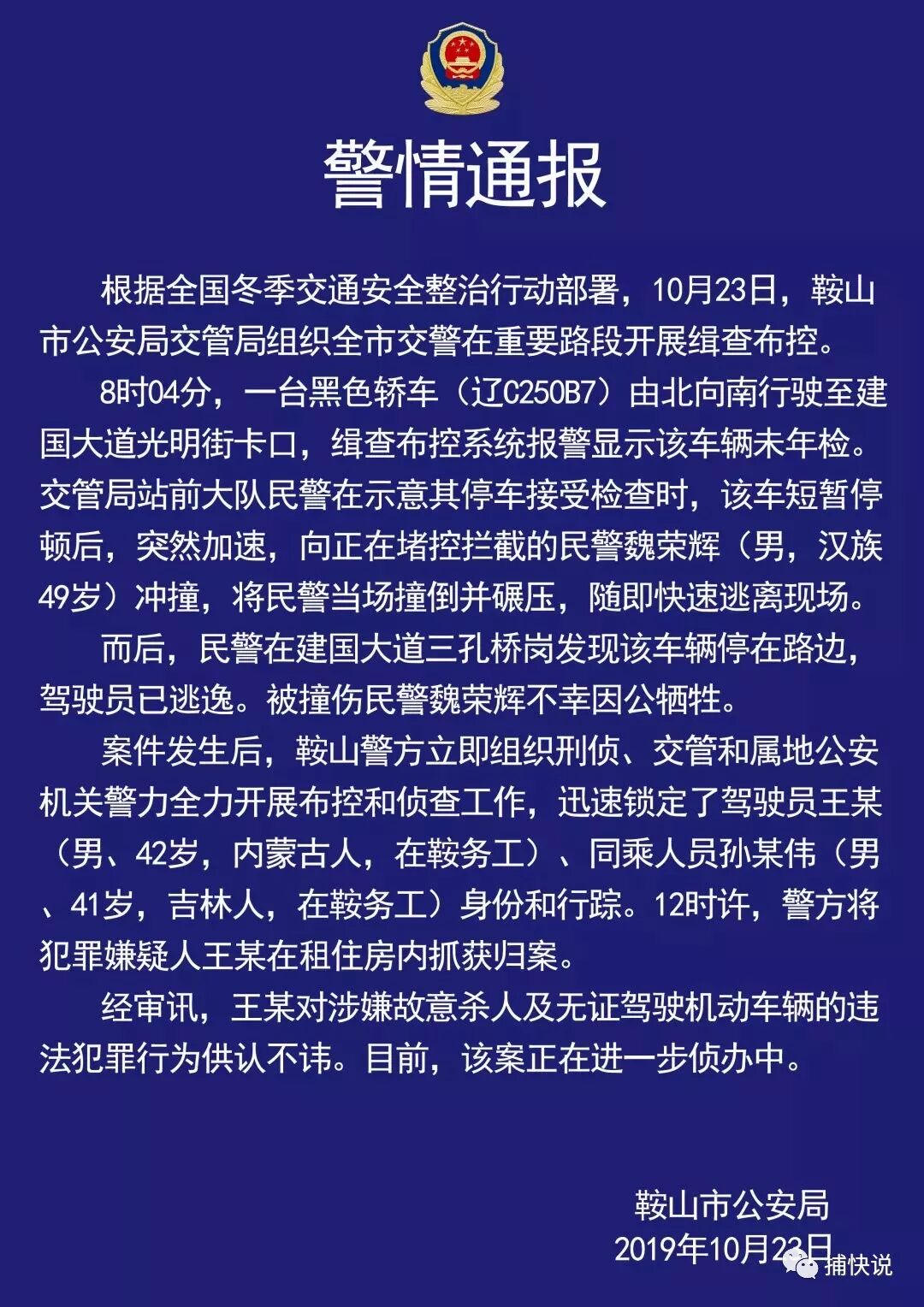 案件发生后,鞍山警方立即组织刑侦、交管和属地公安机关警力全力开展布控和侦查工作,迅速锁定了驾驶员王某(男、42岁,内蒙古人,在鞍务工)、同乘人员孙某伟(男、41岁,吉林人,在鞍务工)身份和行踪。12时许,警方将犯罪嫌疑人王某在租住房内抓获归案。