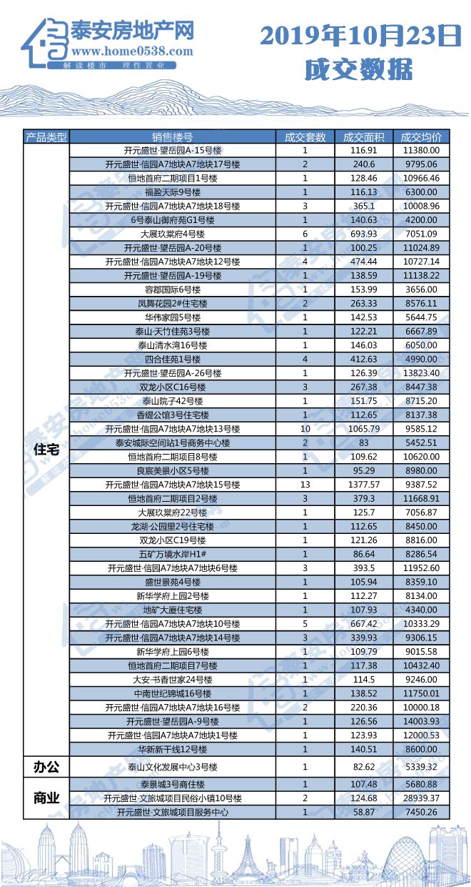 【泰安房地产网讯】据本站不完全统计,2019年10月23日泰安市共成交商品房99套,其中住宅网签94套,办公网签1套,商业网签4套,与10月22日相比,环比上涨110.64%。