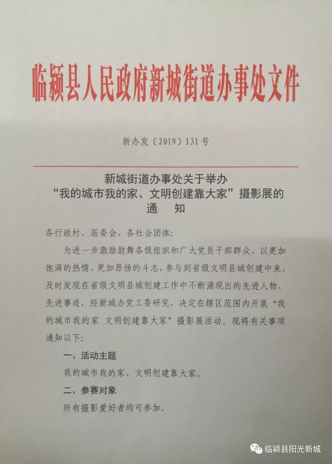 为进一步激励鼓舞各级组织和广大党员干部群众,以更加饱满的热情、更加昂扬的斗志,参与到省级文明县城创建中来,及时发现在省级文明县城创建工作中不断涌现出的先进人物、先进事迹,经新城办党工委研究,决定在辖区范围内开展“我的城市我的家文明创建靠大家”摄影展活动。现将有关事项通知以下: