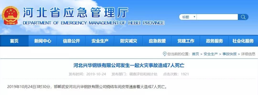 10月24日,河北省应急管理厅发布事故快报信息称:2019年10月24日3时30分,邯郸武安河北兴华钢铁有限公司烧结车间皮带通廊着火造成7人死亡。