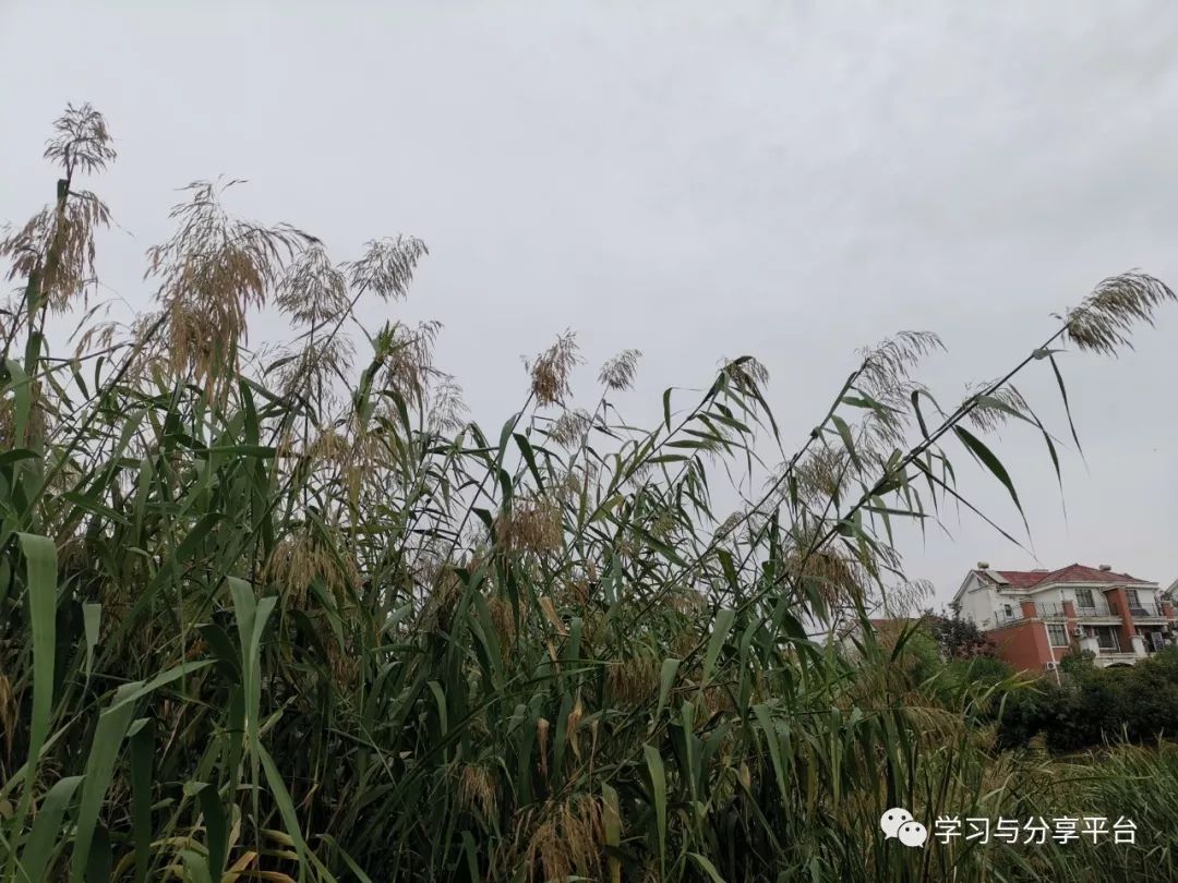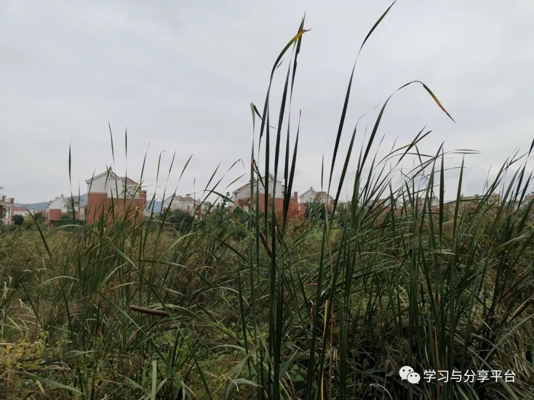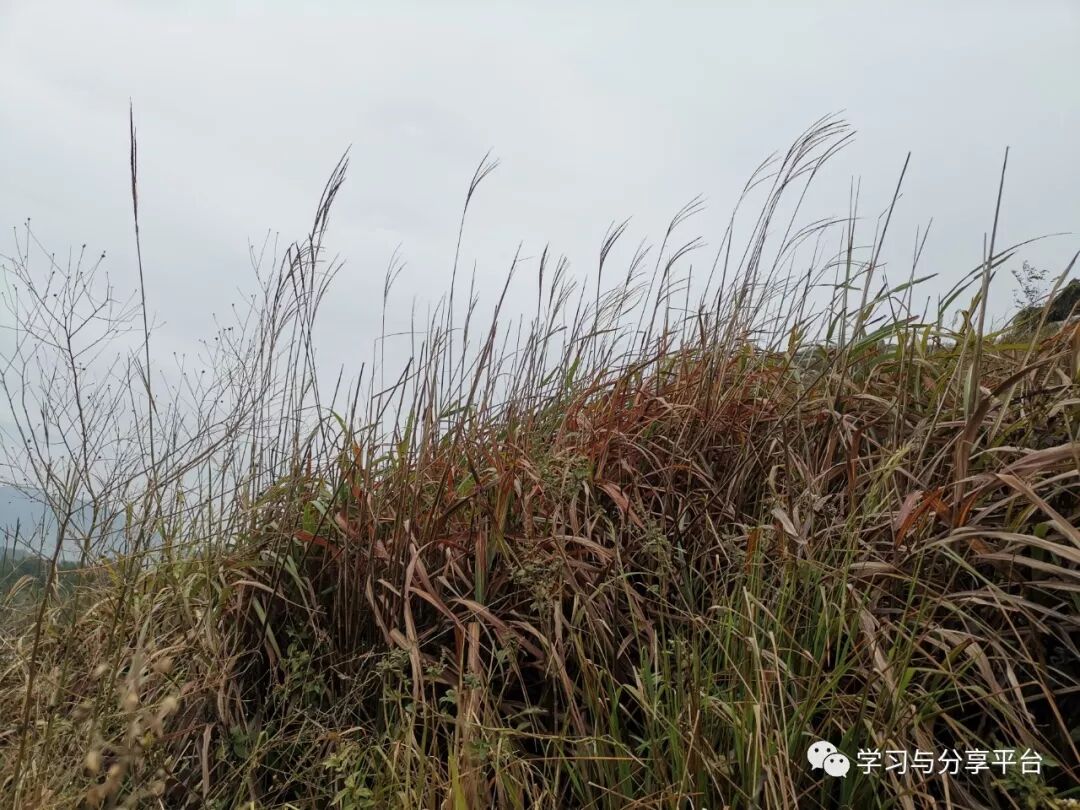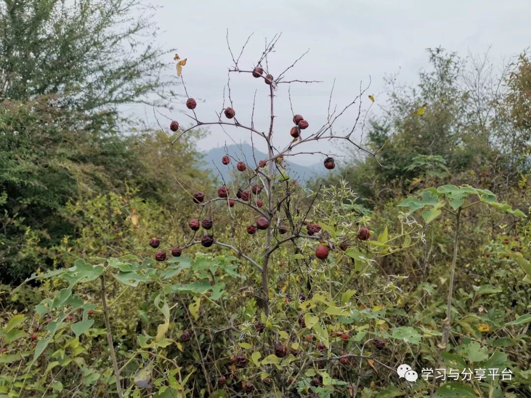 野草丛中偶尔可见几株野菊花,在湿润的晨露里显出几分娇艳;苍耳在路边一株株的顽强生长着,它的种子还是毛茸茸的犹如浑身张满嫩刺的绿色毛毛虫;荆条结满了串串乌黑的果实,沉甸甸的压弯了枝头;一株红叶石兰生长在路边,叶色鲜艳夺目,据说这种植物霜重色逾浓,低温色更佳。路边还有狗尾巴草、山柴草等好多不知名的野草在微风中轻轻摇曳……