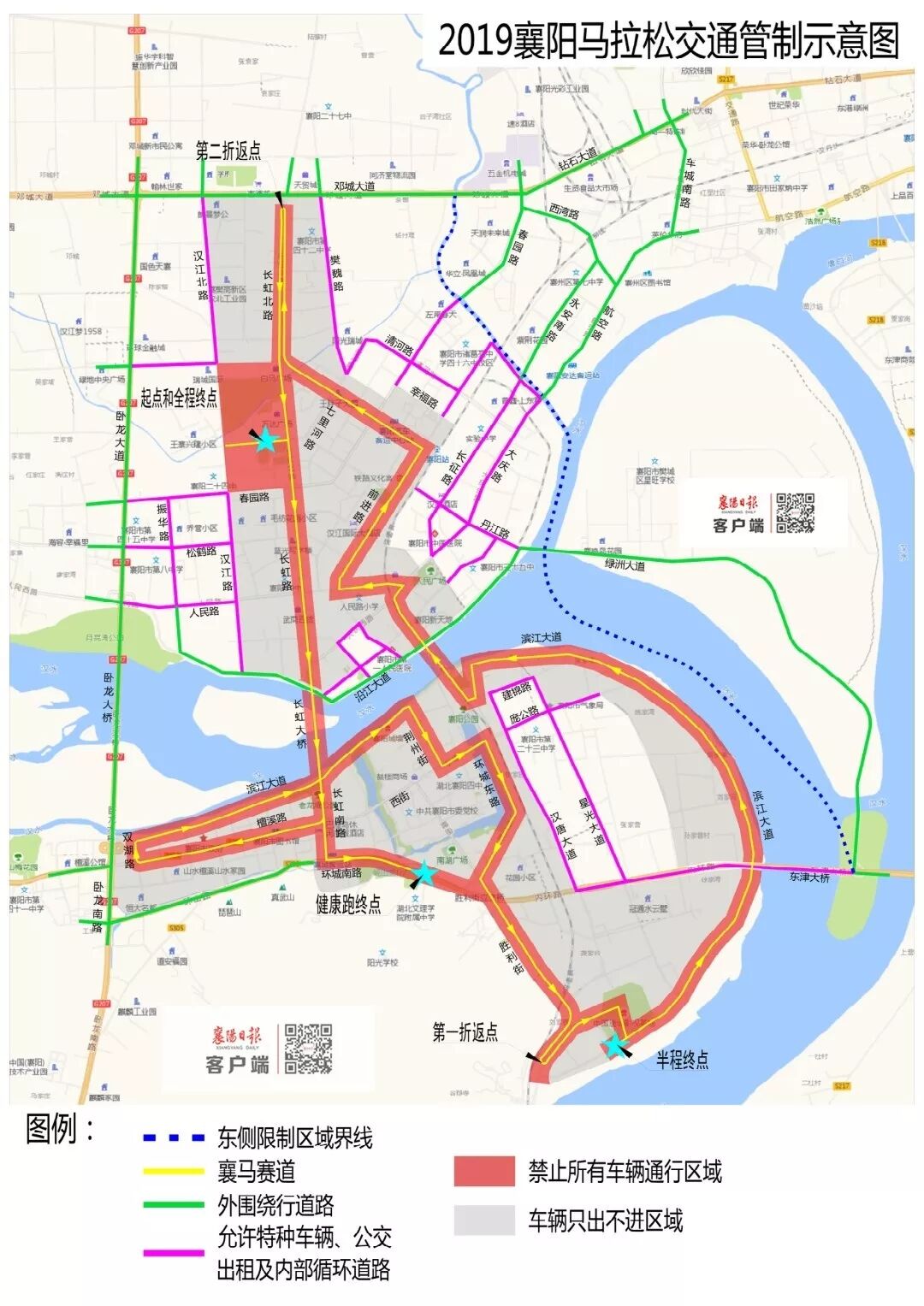 1路:07:40-9:00受荆州街东街路口封闭影响,期间线路停止运行,9:00-14:00健康跑结束后至前进路襄阳火车站路口解除封闭期间,车辆由岘山广场停车场发车经环城南路、长虹二桥、长虹路、春园路、新华路前进路口调头,往返运行。在半程马拉松结束后绕行至习家池疏散参赛选手,由胜利街、南街、西街、长虹二桥、长虹路、春园路、新华路前进路口调头。