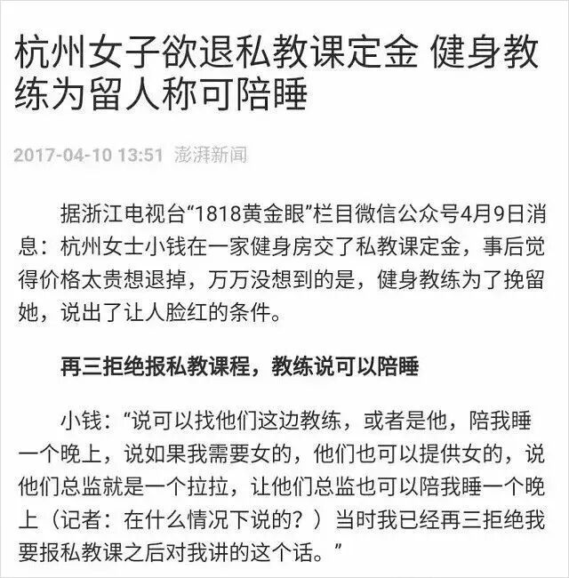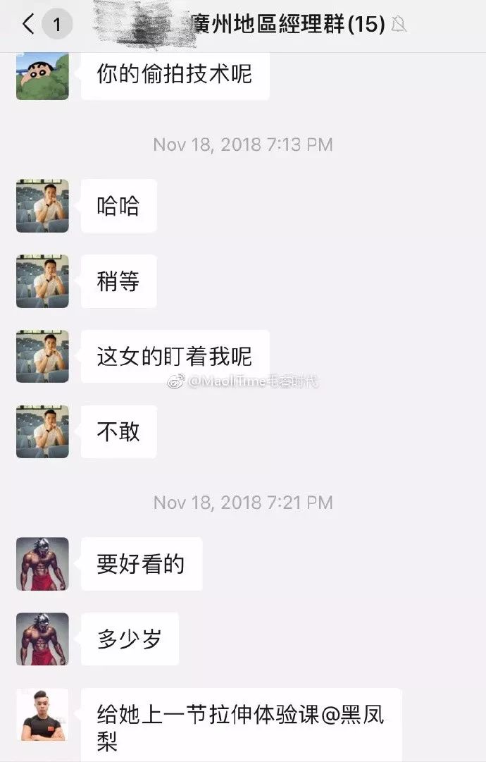 此前,广州某健身房的私教经理群就爆出过一起丑闻;他们同样约P,偷拍,然后分享到群里,供那些教练取乐。▼还有更早的私教圈的事