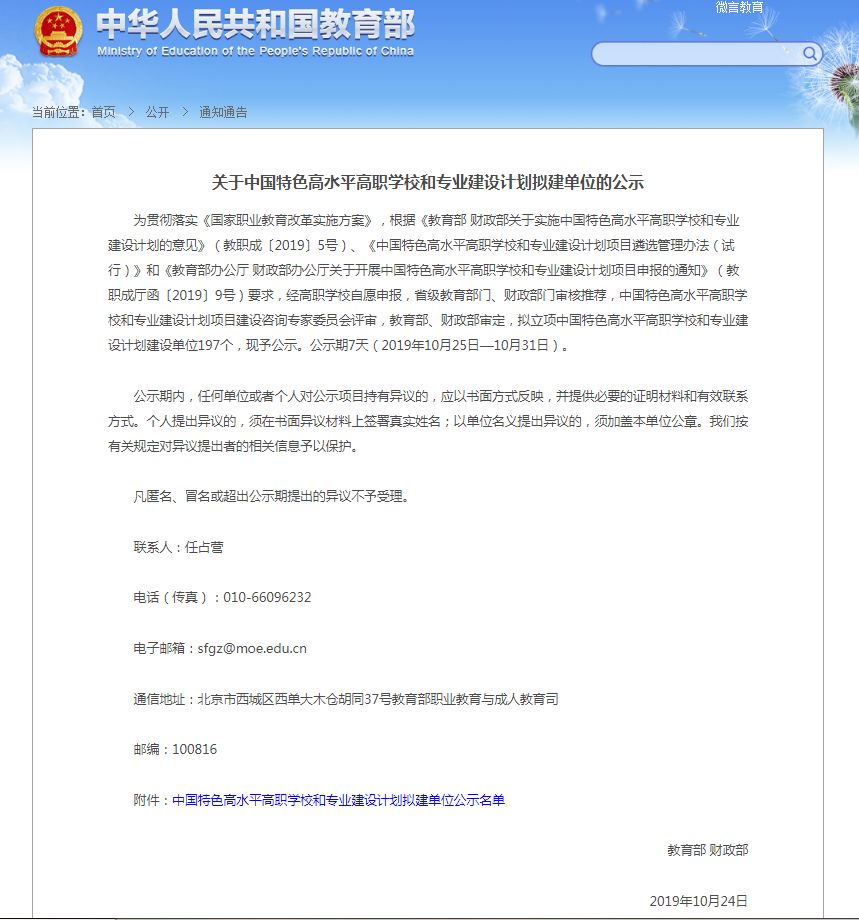 《关于中国特色高水平高职学校和专业建设计划拟建单位的公示》