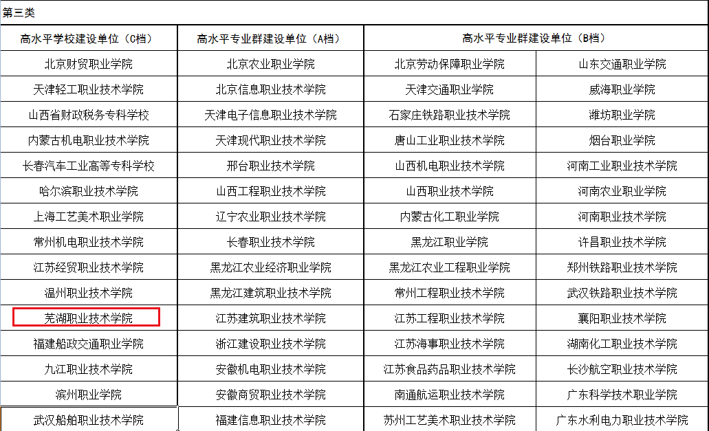 芜湖职业技术学院是全国首批、安徽首所国家示范性高等职业院校和国家高职高专人才培养工作水平评估优秀院校,为全国第二批深化创新创业教育改革示范校(安徽唯一一所高职院校入选),全国首批现代学徒制试点院校(已通过验收),安徽省“四年一贯制”技术技能型本科人才培养模式改革试点院校,安徽省第二批“三全育人”综合改革试点院校。学校创建于1983年,原名芜湖联合大学。1997年5月,经原国家教委批准更改为现名。2000年8月,经安徽省人民政府批准,将具有百年办学历史的芜湖农业学校并入学校。学校2001年被教育部确定为全国31所示范性职业技术学院建设单位之一,2006年被教育部、财政部列为“国家示范性高职院校建设计划”首批28所立项建设院校之一,2009年学校以优秀等级通过教育部、财政部国家示范性高等职业院校项目验收。2012年5月,经安徽省人民政府批准,学校与芜湖信息技术职业学院合并,为学校跨越式发展注入新的活力。