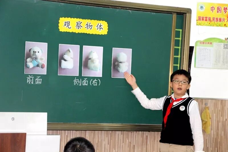 李东晓老师执教数学课《观察物体》,盲人摸象的视频吸引孩子们探索的兴趣,客人“小熊”的参与让课堂变得更加生动,不同位置的转换让物体观察变得“动”起来,学生学在其中,乐在其中。