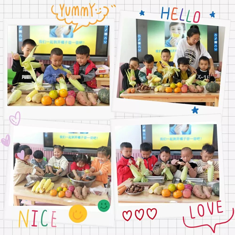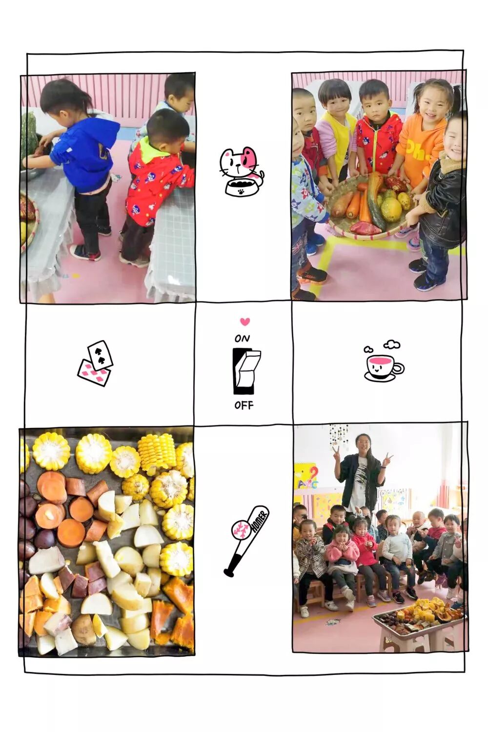 在家长们的积极配合下,小班孩子们带来了红薯、花生、玉米、栗子等,一场“果实分享联欢会”在园区内浓情上演。孩子们在老师和厨房师傅的帮助下,一起将丰收的果实做成了香甜的食物,并把这些美味的食物和愉快的心情一同分享给所有的人,大家的脸上都洋溢着满满的幸福。