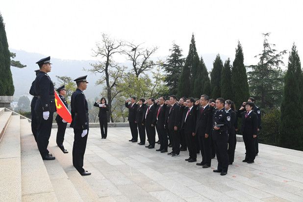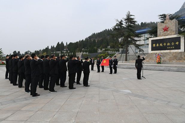 在庄严肃穆的纪念碑前,中院党员干警怀着无比崇敬的心情向革命烈士敬献花篮、默哀致敬,并面向党旗重温了入党誓词。