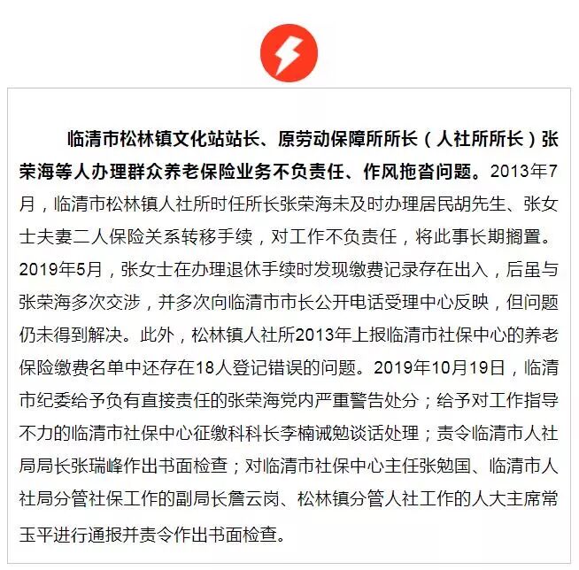 阳谷县人力资源和社会保障局党组书记、局长王勇等人在办理劳动监察、劳动争议仲裁事项中漠视群众利益、长期未办结问题。2018年7月,聊城市公安局交警支队阳谷大队劳务派遣人员张某某因泄露执法信息被解除劳动合同。2018年12月、2019年1月,张某某先后向阳谷县劳动监察局(阳谷县人力资源和社会保障局下属事业单位)提出劳动监察投诉,向阳谷县劳动人事争议仲裁院(由阳谷县人力资源和社会保障局管理)提出劳动争议仲裁申请。阳谷县人力资源和社会保障局(以下简称阳谷县人社局)决定实行劳动监察和劳动仲裁办案一体化模式,由副局长杜存虎带领主持劳动监察局工作的刘玉鹏、劳动监察大队二中队副队长潘凡勇、劳动人事争议仲裁院主任丁锡军等人具体办理。杜存虎明知受理、立案查处超越法定时限,且张某某多次要求依法处理,仍决定进行调解,致使该案长达9个月未结,对此杜存虎负有直接责任;杜存虎等人多次汇报案情后,阳谷县人社局党组书记、局长王勇未要求严格依法办理,仍决定以调解为主,对此负有领导责任,且其对涉及群众切身利益的问题不积极作为、未向县委政府提出统筹解决方案,在电视问政现场回避问题,造成不良影响。此外,在案件办理过程中,阳谷县劳动人事争议仲裁院存在未履行仲裁申请受理手续、未按期作出裁决等不正确履行职责问题,对此丁锡军负有直接责任;阳谷县劳动监察局在立案调查完毕后,未按法定时限作出处理决定,对此刘玉鹏、潘凡勇负有直接责任。2019年10月24日,聊城市监委给予阳谷县人社局副局长杜存虎政务记过处分;给予阳谷县劳动人事争议仲裁院主任丁锡军、阳谷县劳动监察大队副大队长、二中队队长刘玉鹏政务警告处分;对阳谷县劳动监察大队二中队副队长潘凡勇批评教育;对阳谷县人社局党组书记、局长王勇通报批评。