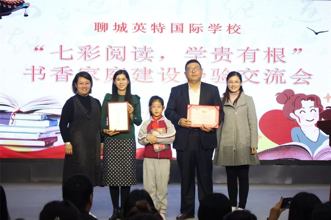 最后,韩玉凊蕊和盛子潇家庭作为优秀阅读家庭代表领取“书香家庭”荣誉证书和奖牌。