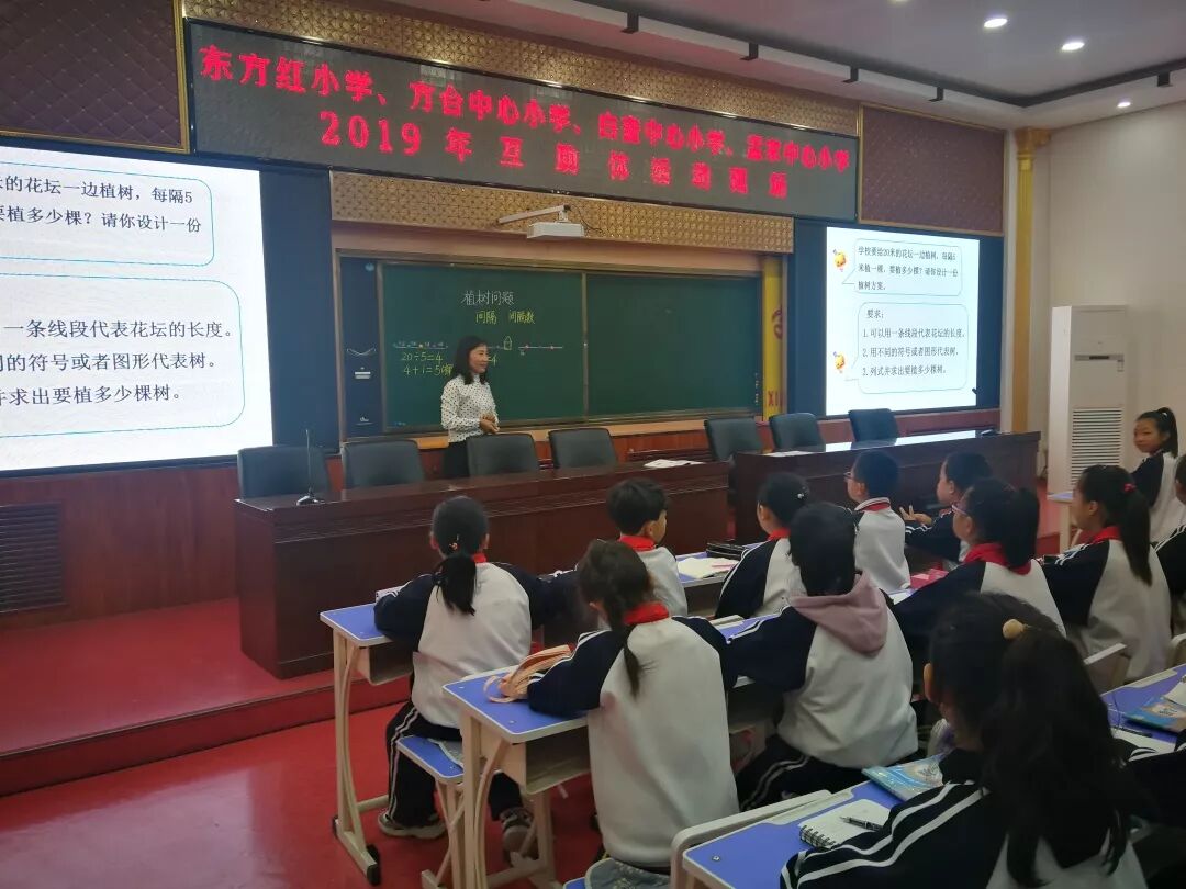 东方红小学何迎春老师和白奎中心小学的李佳欣老师分别展示了五年级数学《植树问题》,两位老师教法灵活,能够结合生活实际分析问题,突出小组合作意识,多角度培养学生的数学思维,能够在同样的课题中用不同的思维不同的教法分别解读了同样的课程,带来同样大的收获。